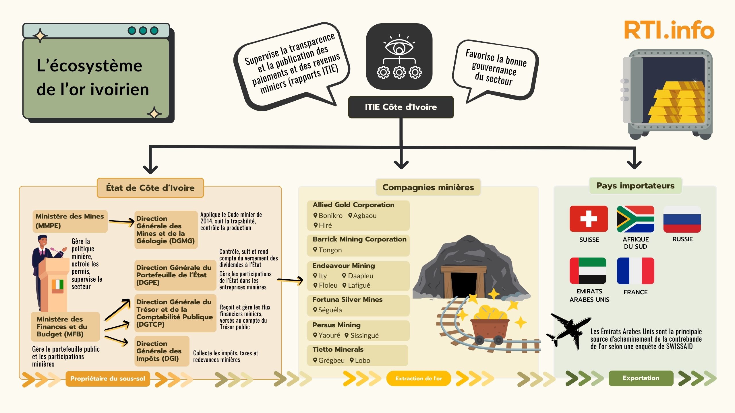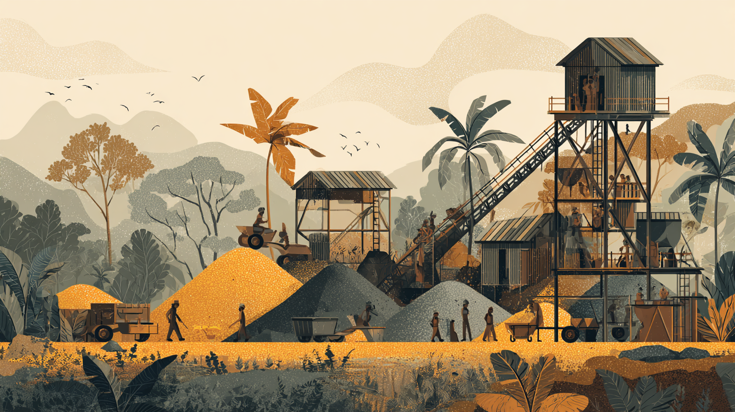 Graphiques réalisés sur Flourish. Infographie "L'écosystème de l'or ivoirien" créée sur Canva. Illustrations générées par l'intelligence artificielle (Midjourney)