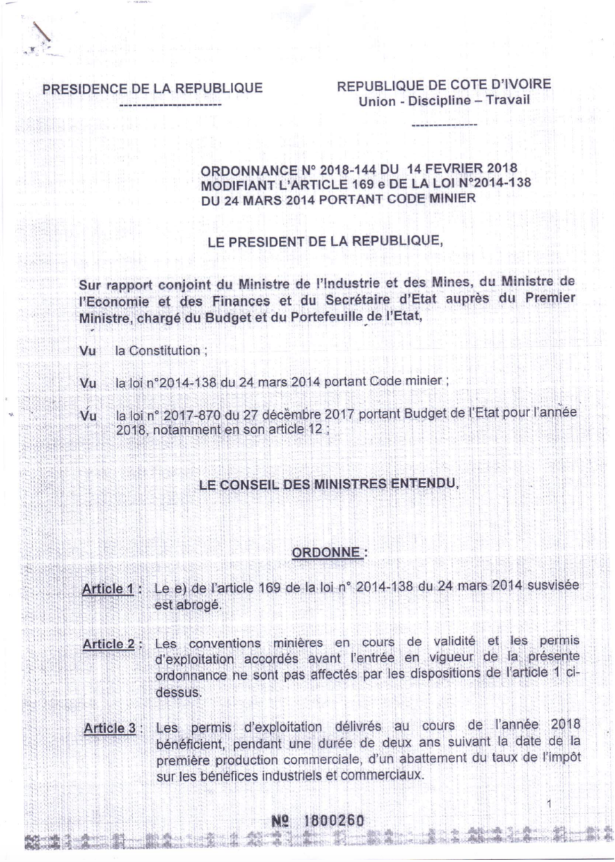 Le 9 décembre 2019, le ministère des Mines ivoirien cède aux négociations en accordant la suppression de l’impôt minimum forfaitaire et l’exonération sur le bénéfice industriel et commercial sur cinq années au profit des compagnies minières Endeavour Mining et Perseus Mining, après la signature de deux conventions pour l’exploitation respectivement des gisements aurifères de Daapleu et de Gbétibouo à l’ouest et de Yaouré au centre.