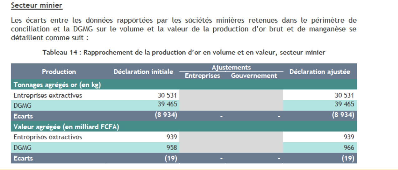 Capture d’écran/Rapport ITIE 2021, 19 milliards de francs CFA d’écarts de production d’or