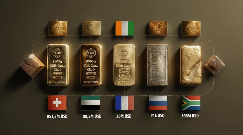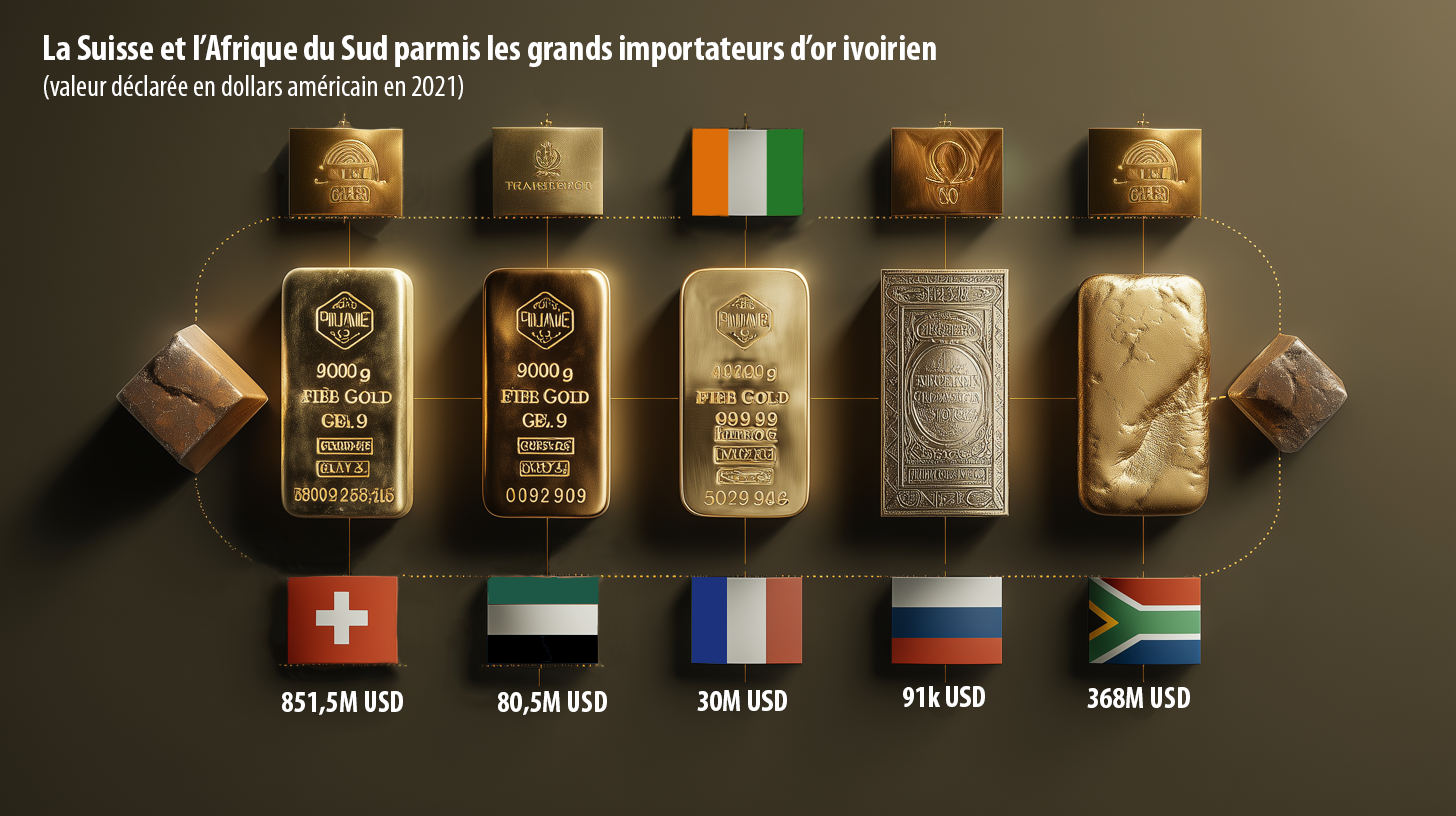 Selon la base internationale de suivi du commerce, en 2021, la Suisse, l’Afrique du Sud, les Émirats Arabes Unis, la France et la Russie, principaux pays partenaires, disent avoir importé 34,97 tonnes d'or ivoirien pour une valeur de 1,42 milliard de dollars américains, environ 782,9 milliards de francs CFA. La comparaison de ces données révèle que plus de 8,7 tonnes d’or (environ 157,6 milliards de francs CFA) semblent avoir échappé aux caisses de l'État ivoirien en 2021.