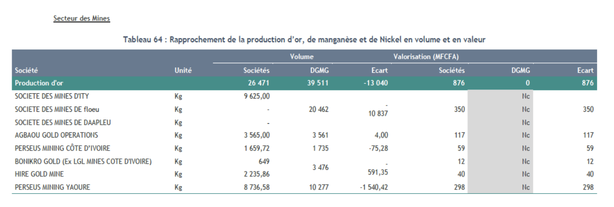 À titre d’exemple, dans son rapport annuel, le groupe Endeavour Mining affirme que la mine d’Ity a produit environ 230 000 onces d’or cette année-là, soit près de 7 154 kg. Pourtant, les chiffres transmis à l’ITIE et à la DGMG ne correspondent pas à ce volume.